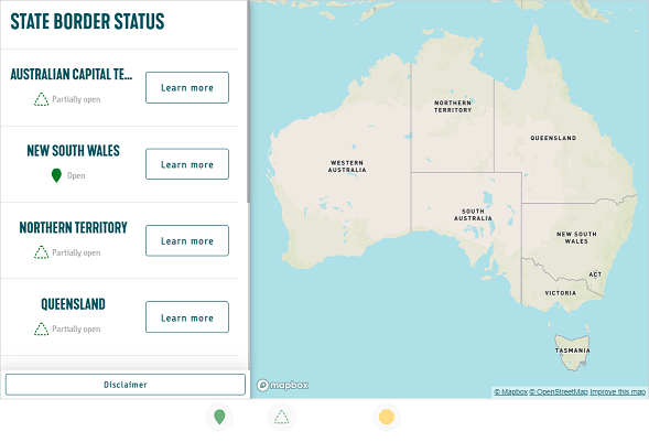 オーストラリア政府観光局の公式ウェブサイトでは、州間の移動の可否を分かりやすく地図でご案内しています。(英語のみ)